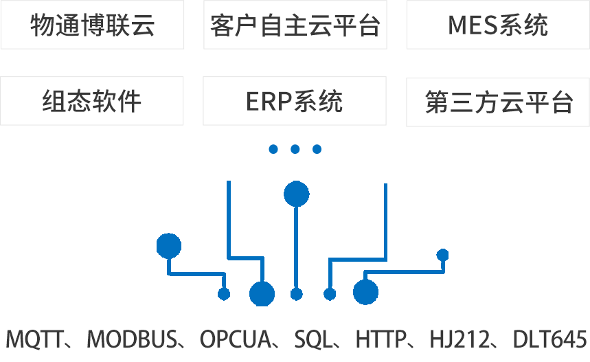 北向支持接入long8龙8国际云平台,客户自主开发的云平台,第三方云平台(根云、美云、华为、阿里、百度、微软等IOT云平台),组态软件、MES系统、行业监控平台等工业软件