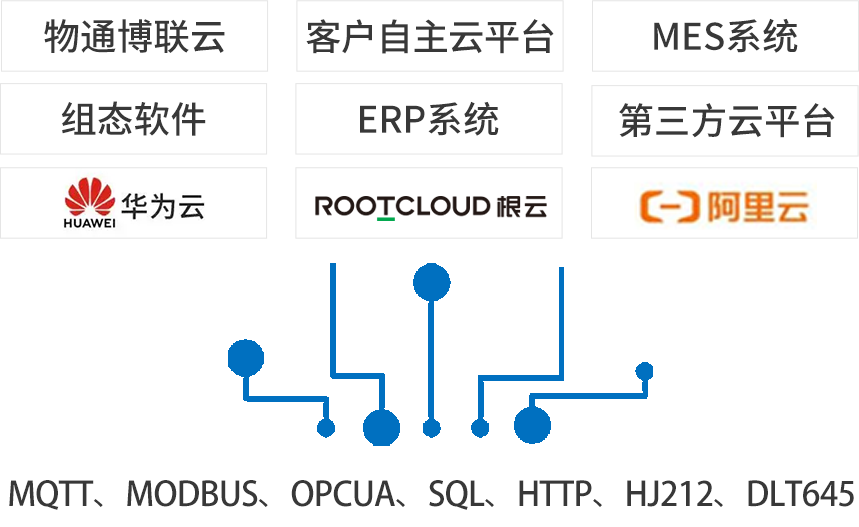 北向支持接入long8龙8国际云平台,客户自主开发的云平台,第三方云平台(根云、美云、华为、阿里、百度、微软等IOT云平台),组态软件、MES系统、ERP系统等工业软件